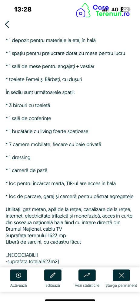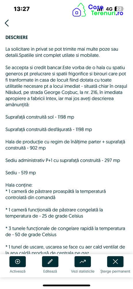 De vinzare—-pt .solicitare in privat se pot trimite mai multe poze sau detalii.Spatiile sint complet utilate si mobilate.Se accepta si credit bancar.Este vorba de o hala cu spatiu generos pt prelucrare si spatii frigorifice si birouri care pot fi tranformate in casa de locuit fiind dotata cu toate utilitatile necesare pt a locui imediat - situată chiar în orașul Năsăud, pe strada George Coșbuc, la nr. 216, în imediata apropiere a fabricii Intex, iar mai jos aveți descrierea amănunțită:Suprafață construită sol - 1198 mpSuprafață construită desfășurată - 1198 mpHala de producție cu regim de înălțime parter + suprafață construită - 902 mpSediu administrativ P+1 cu suprafață construită - 297 mpSediu - 519 mpHala conține:* 1 cameră de păstrare proaspătă la temperatură controlată din comandă* 1 cameră funcțională de păstrare congelată la temperatura de - 25 de grade Celsius* 3 tunele funcționale de congelare rapidă la temperatura de - 50 de grade Celsius* 1 tunel de uscare, uscarea se face cu aer cald ventilat de la apa caldă produsă de centrala pe gaz* 1 depozit pentru materiale la etaj în hală* 1 spațiu pentru prelucrare dotat cu mese pentru lucru* 1 sală de mese pentru angajați + vestiar* toalete Femei și Bărbați, cu dușuriÎn sediu sunt următoarele spații:* 3 birouri cu toaletă* 1 sală de conferințe* 1 bucătărie cu living foarte spațioase* 7 camere mobilate, fiecare cu baie privată* 1 dressing* 1 cameră de pază* loc pentru încărcat marfa, TIR-ul are acces în hală* loc de parcare, garaj și cameră pentru păstrat agregateleUtilități: gaz metan, apă de la rețea, canalizare de la rețea, internet, electricitate trifazică și monofazică, acces în curte din șoseaua națională hala fiind cu intrare directă din Drumul Național, cablu TVSuprafața terenului 1623 mpLiberă de sarcini, cu cadastru făcut.,NEGOCIABIL!!-suprafata totala1623m2)