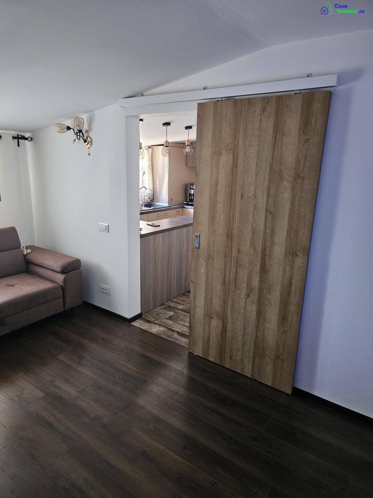 Apartament situat la confecții camin,mansarda ,nu e garsoniera e Apartament cu doua camere revovat in 2023 totul este nou,imbunatatiri in tot apartamentul,il dau cu tot ce este in el:Baie renovata cu cabina de dus si instalatie nouaBucatarie facuta la comanda cu tot ce este in eaCentrala nouaGresie,frigider incorporat in mobila de bucatarieHotaMasina de spalat vaseMasina de spalat haineCuptor microunde sageMasina de cafea JavaUsi culisateParchet nouCanapeaTelevizorInternetUsa prin culisareDormitor tot nou facut la comandaPat dublu cu saltea nouDulapuri pentru haineEste pentru cine vrea numai sa puna haina in cui si sa locuiascaApartamentu are 39 de metri patratiPret 60000de euro negociabil